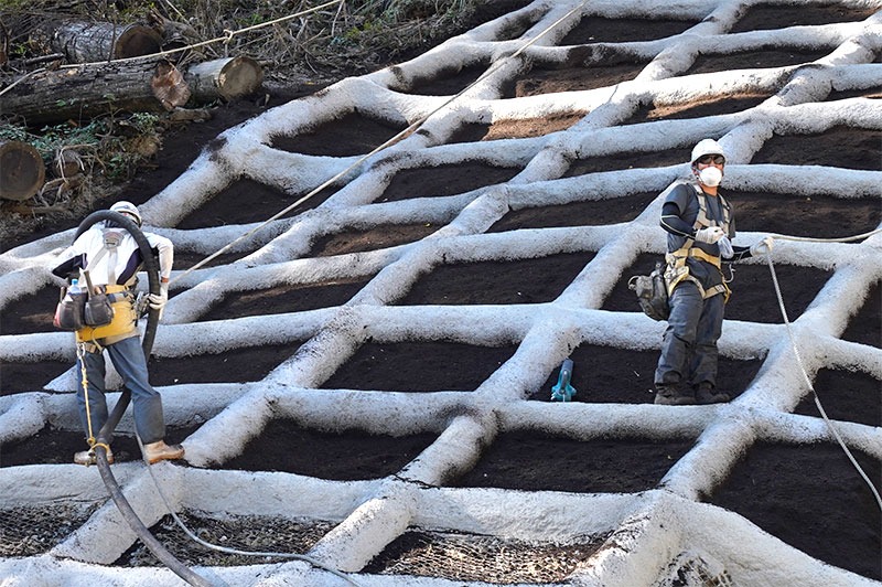 表面の浸食や風化対策だけでなく、深い箇所の崩壊や崩落対策のためにアンカーや杭などを地山に挿すことも構造物工になります。